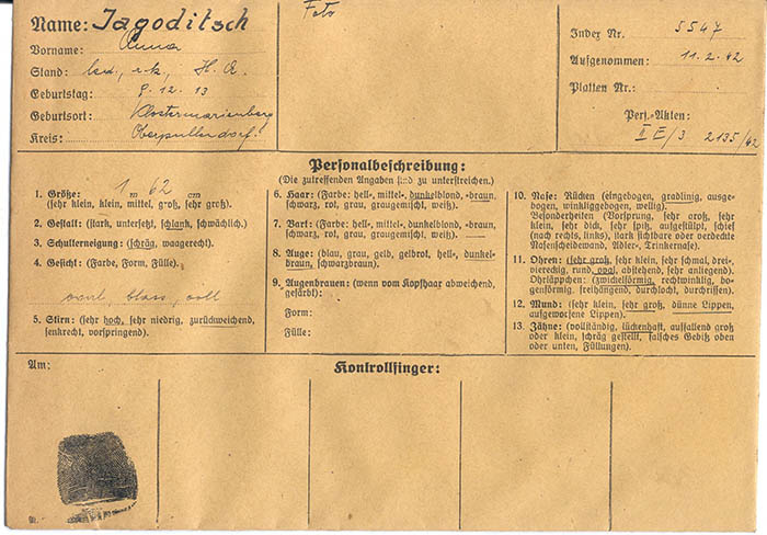 Die Hilfsarbeiterin Anna Jagoditsch wurde wegen "verbotenen Umgangs" am 11. 2. 1942 von der Gestapo Wien erkennungsdienstlich erfasst und am 25. 4. 1942 in das KZ Ravensbrück eingewiesen.