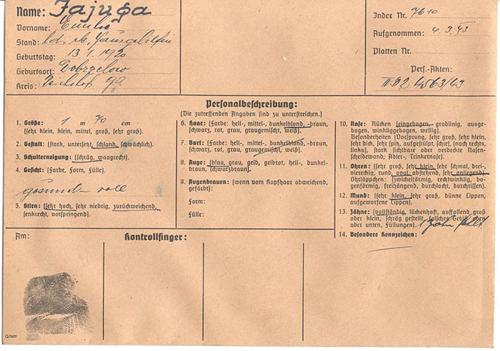 Die polnische Hausgehilfin Emilie Jajuga wurde am 4. 3. 1943 wegen "verbotenen Umgangs" von der Gestapo Wien erkennungsdienstlich erfasst. Sie war in der Folge in Auschwitz in Haft und wurde von dort im Jänner 1945 in das KZ Ravensbrück überstellt.