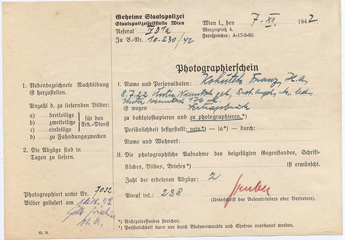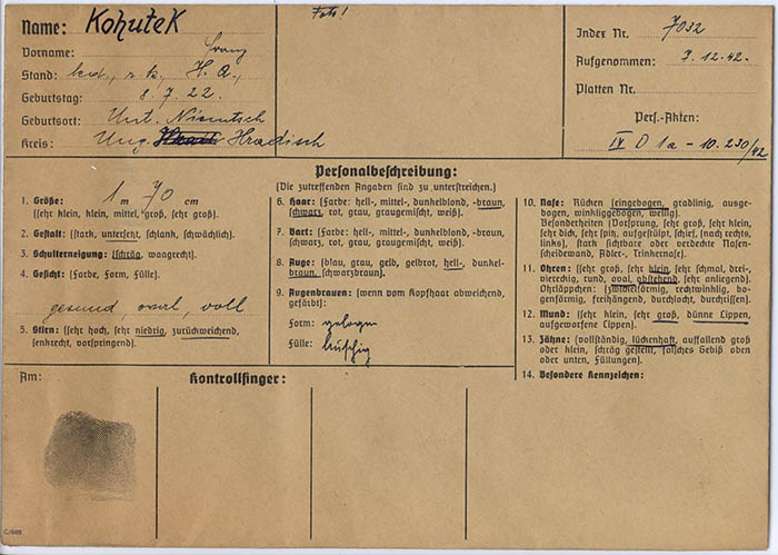 Der tschechische Hilfsarbeiter Franz Kohutek wurde wegen "Arbeitsvertragsbruchs" am 7. 12. 1942 von der Gestapo Wien erkennungsdienstlich erfasst. Er war vom 27. 3. 1943 bis 12. 1. 1944 im KZ Dachau in Haft.