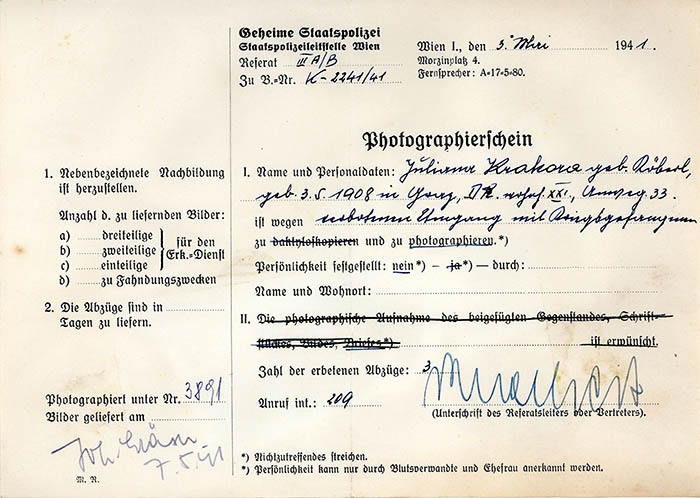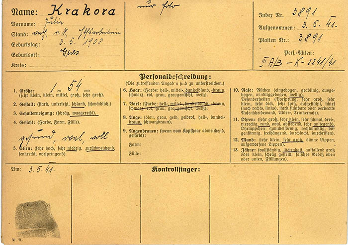 Die Hilfsarbeiterin Julie Krakora wurde am 3. 5. 1941 wegen "verbotenen Umgangs mit Kriegsgefangenen" von der Gestapo Wien erkennungsdienstlich erfasst.