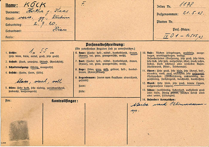 Die Köchin Hertha Köck wurde am 21. 5. 1943 wegen "verbotenen Umgangs" von der Gestapo erkennungsdienstlich erfasst.