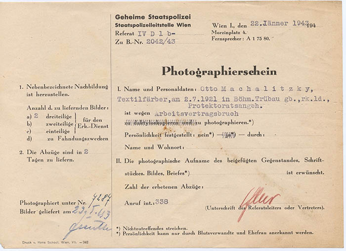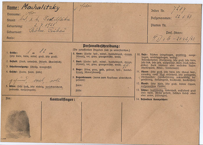 Der Textilfärber Otto Machalitzky wurde wegen "Arbeitsvertragsbruchs" am 22. 1. 1943 von der Gestapo Wien erkennungsdienstlich erfasst.