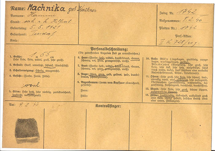Im Zuge von Ermittlungen wegen Wehrmittelbeschädigung in der Enzesfelder Munitionsfabrik wurde die Hilfsarbeiterin Hermine Machnika (Machnyka) am 2. 2. 1940 festgenommen und am 9. 2. 1940 von der Gestapo Wien erkennungsdienstlich erfasst.