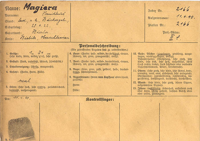 Der polnische Bäckergehilfe Stanislaus Magiera wurde am 11. 4. 1940 von der Gestapo Wien erkennungsdienstlich erfasst. Er wurde am 19. 7. 1940 in das KZ Dachau eingewiesen und war von Mitte August 1940 bis mindestens Herbst 1944 im KZ Mauthausen in Haft.