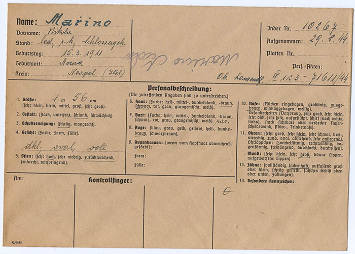 Der italienische Schlossergehilfe Nikola Marino wurde am 29. 8. 1944 von der Gestapo Wien erkennungsdienstlich erfasst. Zu diesem Zeitpunkt war er im Arbeitserziehungslager Oberlanzendorf (NÖ) in Haft.