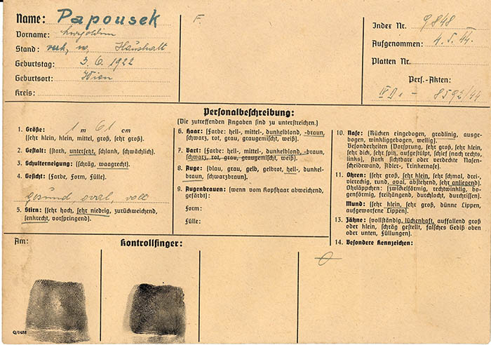 Leopoldine Papousek wurde die Verbreitung eines Spottgedichts über "Piefke" vorgeworfen. Sie wurde am 26. 5. 1944 zu 5 Monaten Gefängnis verurteilt und war vom Mai 1944 bis März 1945 in Haft.